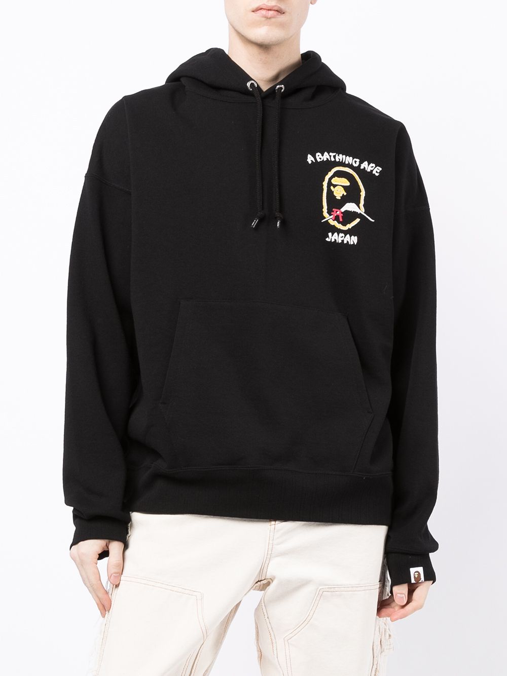 Black cotton embroidered Japan logo hoodie from A BATHING APE® featuring embroidered logo at the chest, drawstring hood, drop shoulder, long sleeves, front pouch pocket and straight hem.