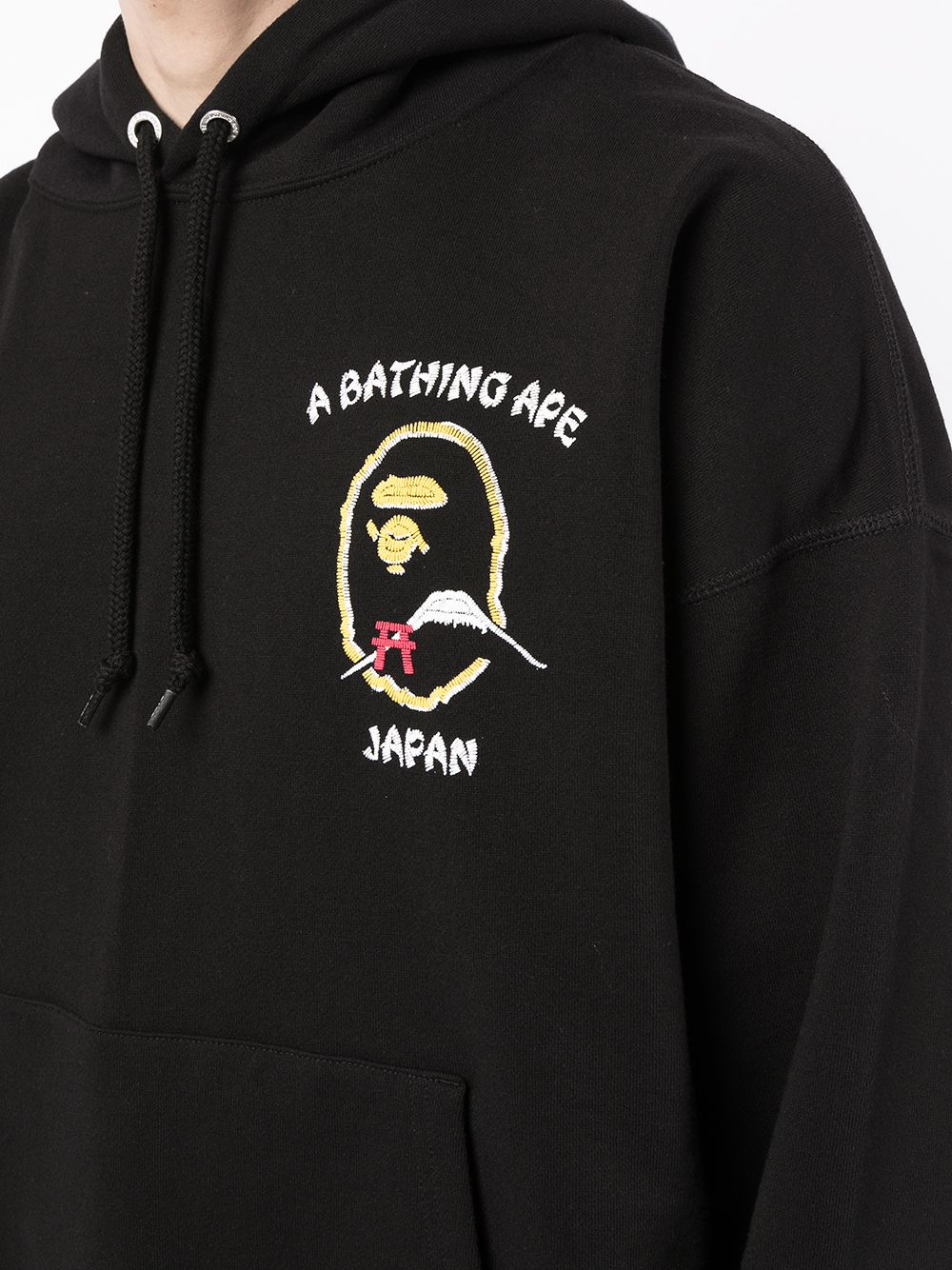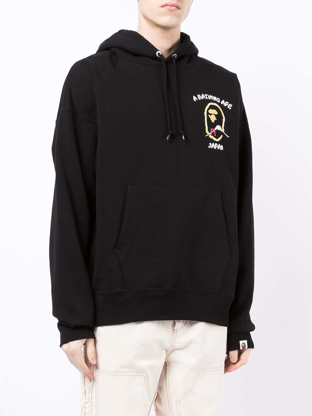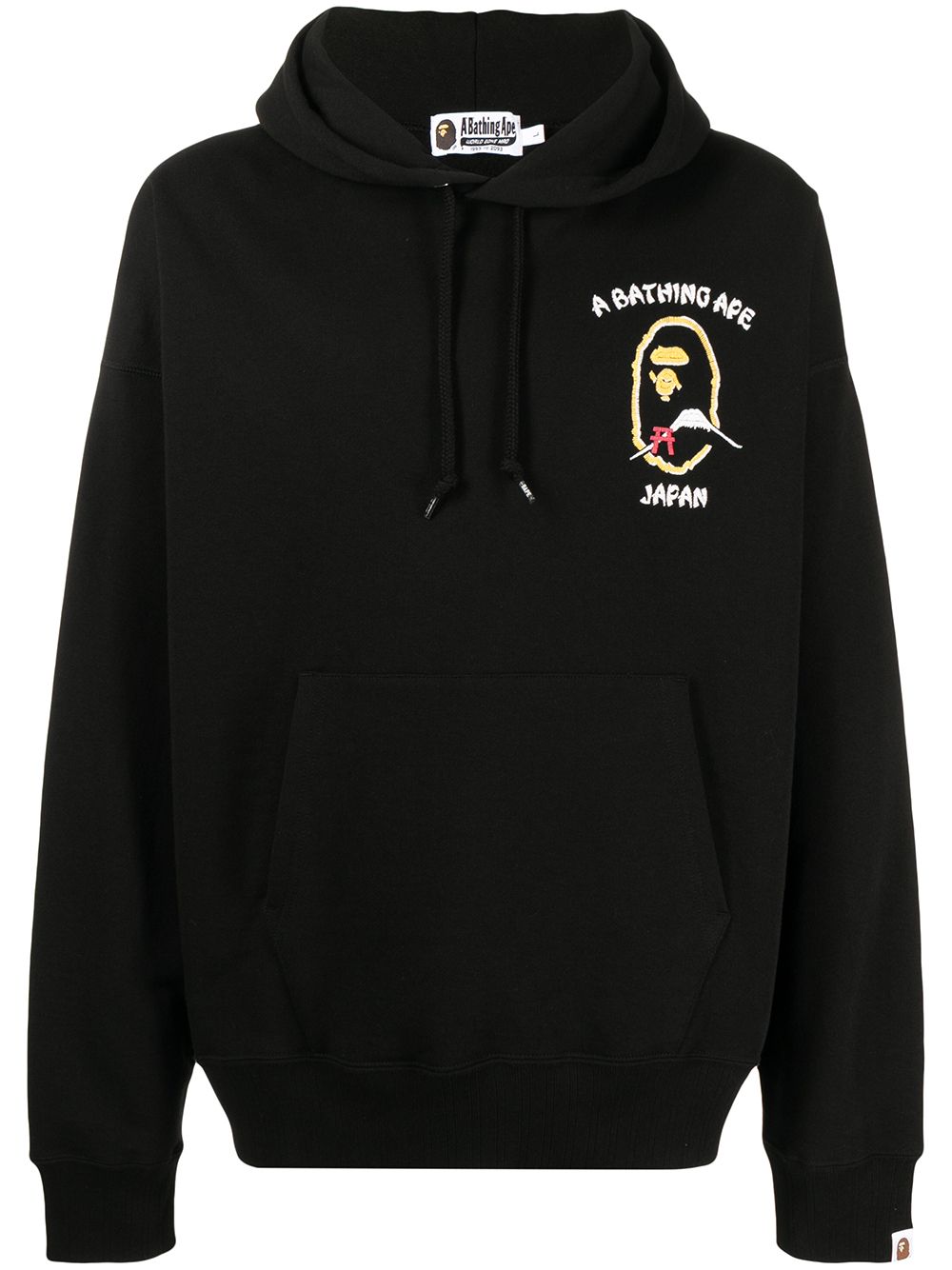 Black cotton Japan logo hoodie from A BATHING APE® featuring logo at the chest, drawstring hood, drop shoulder, long sleeves, front pouch pocket and straight hem.