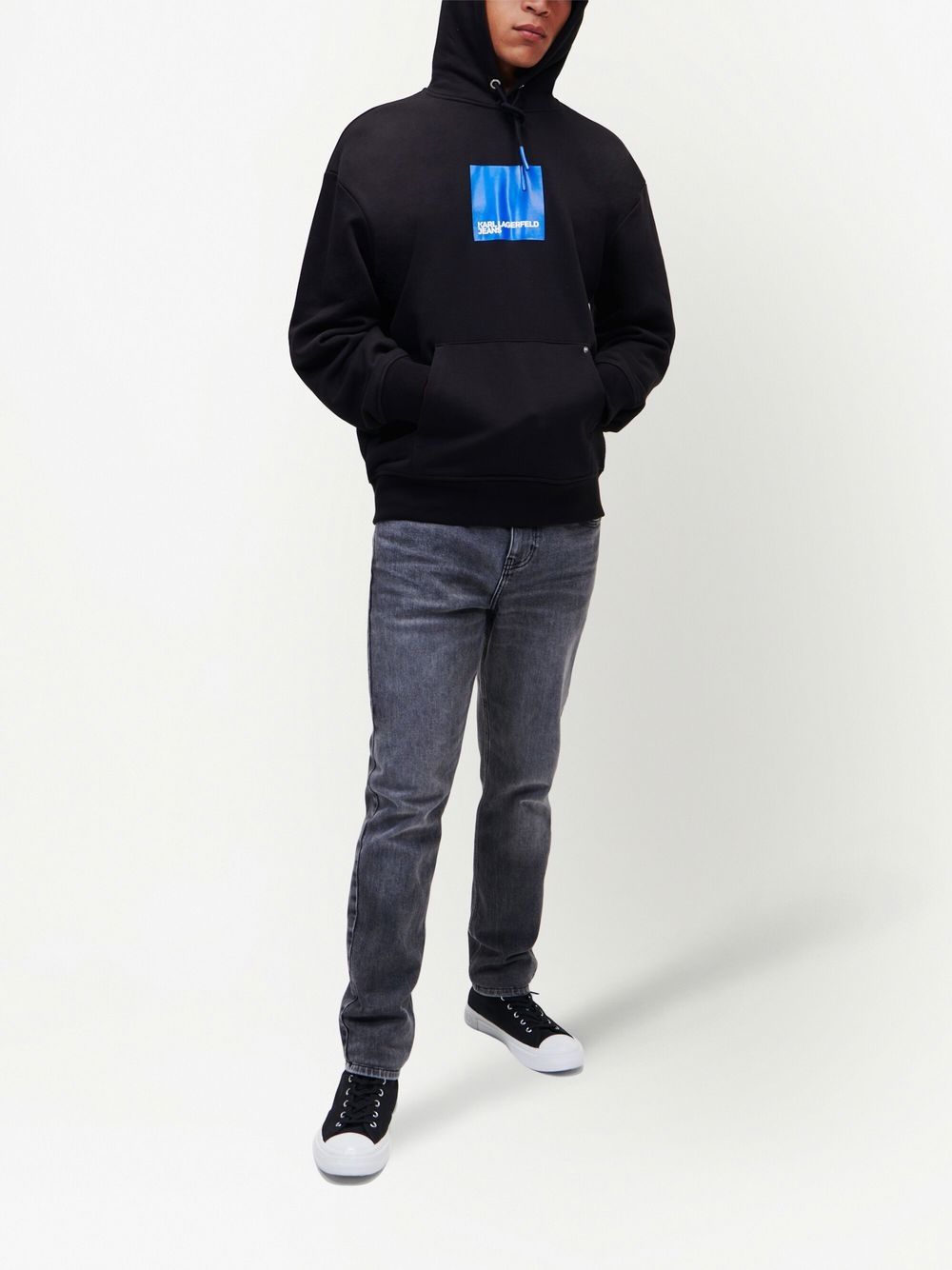 logo-print drawstring hoodie featuring black/blue, logo print to the front, drawstring hood, front pouch pocket, long sleeves and straight hem.