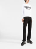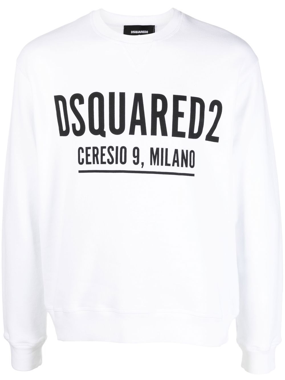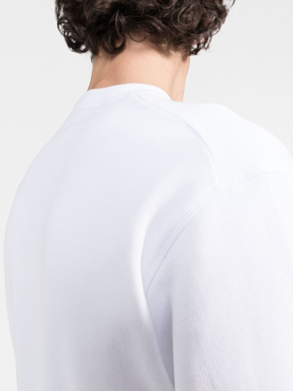 This cotton sweatshirt is boldly branded at the chest with its graphic logo applied in black standing out against the fresh white background.