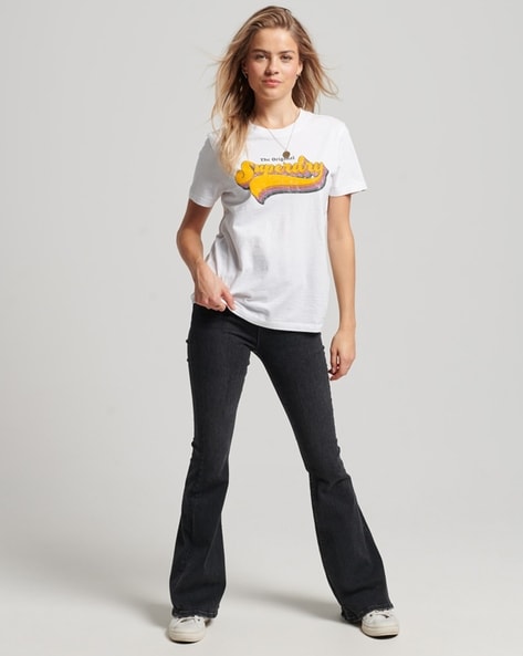 - Channel the superdry spirit through a retro style. The vintage rainbow t-shirt is a love letter to 70s branding, reimagining the superdry logo in a classic print. It makes a sunny pop of colour that compliments your day-to-day wear perfectly - pair it with jeans and trainers for a timeless look. Slim fit â designed to fit closer to the body for a more tailored look, ribbed crew neck collar, short sleeves, printed superdry graphic, signature superdry tab on left sleeve.